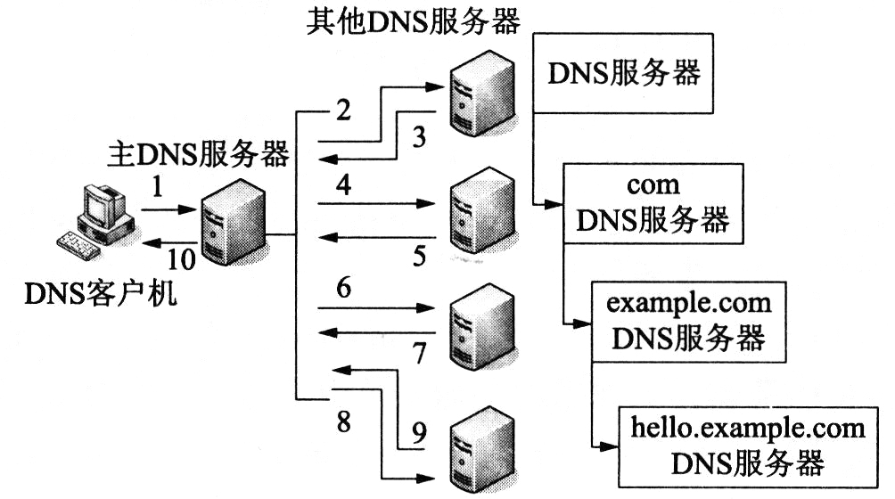 如上图所示,假设客户机要查询的主机地址是host.hello.example.com。首先,主服务器分析全名并确定对顶级域com具有绝对控制权的DNS服务器的IP地址。随后,对该服务器进行查询,以获取example.com子域DNS服务器的地址。接着再对example.com子域的DNS服务器进行查询,以获取hello.example.comDNS服务器的地址。最后,与hello.example.com子域的DNS服务器联系上。该服务器从其配置区域中查询到主机host.hello.example.com所对应的IP地址,并将结果返回给主DNS服务器,主服务器再将此应答转发给客户机,这样整个递归查询过程就完成了。