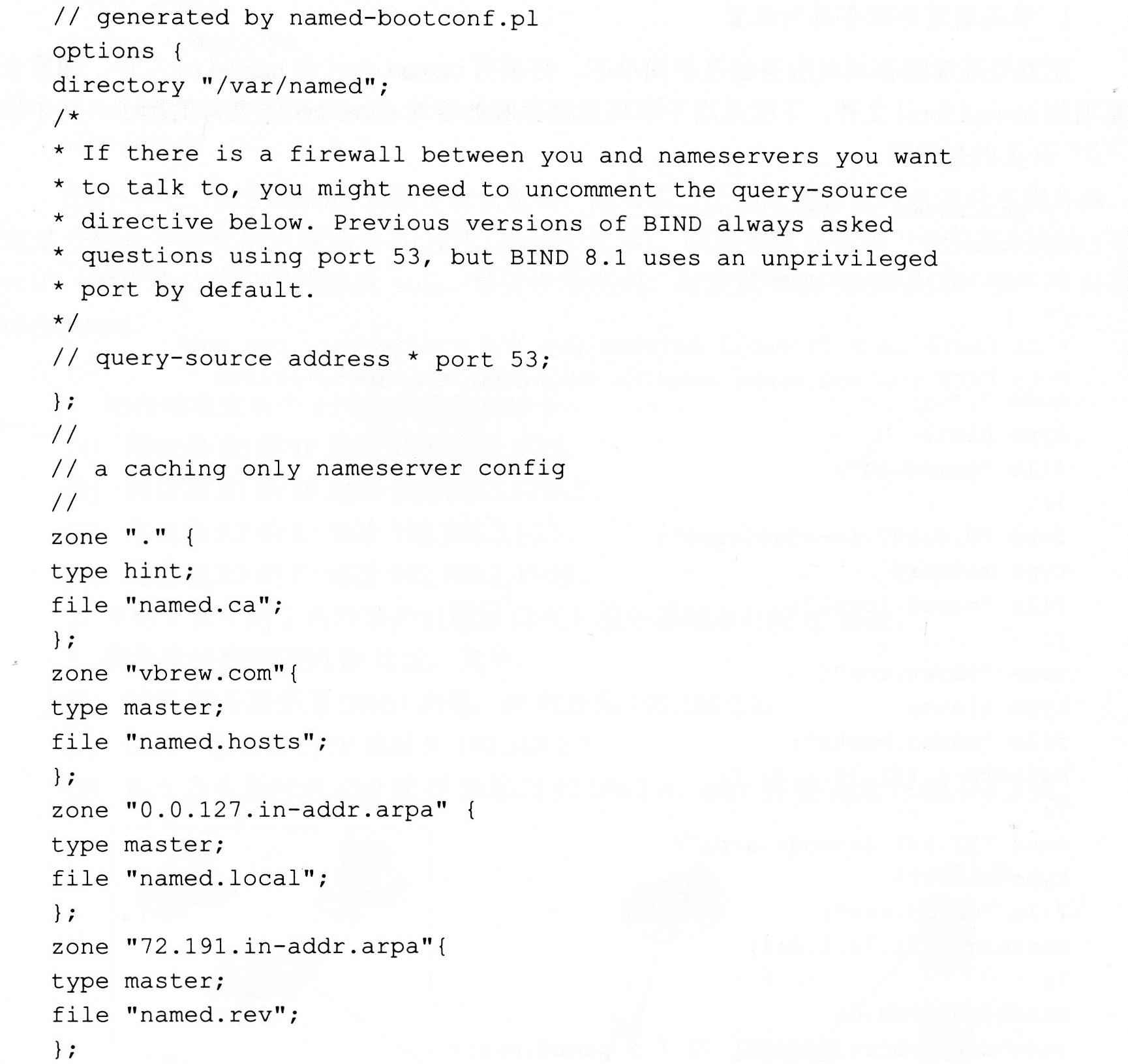 我们虚构的vbrew.com用于说明主服务器和辅助服务器的基础,下面是将vlager定义为vbrew.com域主服务器的named.conf文件。