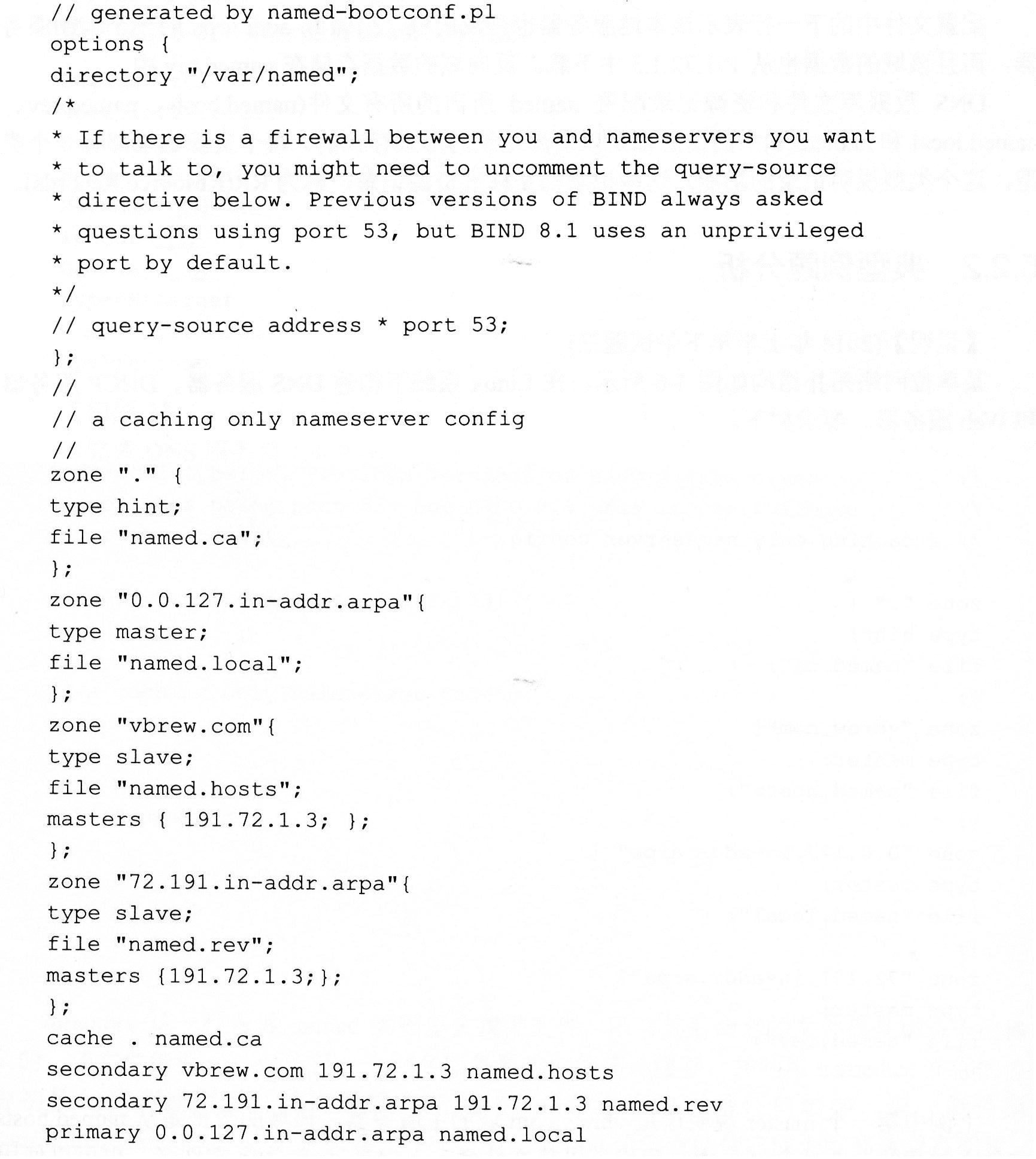 第一个slave语句是使这个服务器成为vbrew.com的辅助服务器。它告诉named从IP地址为191.72.1.3的服务器中下载vbrew.com的信息,并将其数据保存在/var/named/named.hosts文件中。如果该文件不存在,named就创造一个,并从远程服务器中取得区数据,然后将这些数据写入新创建的文件中。如果存在该文件,named就要检查远程服务器,以了解远程服务器的数据是否不同于该文件中的数据。如果数据有变化,它就下载更新后的数据,用新数据覆盖该文件的内容;如果数据没有变化,named就加载磁盘文件的内容,而不必做麻烦的区转移工作。