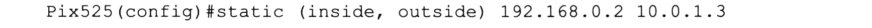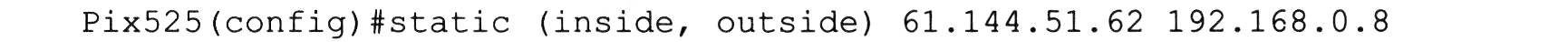 表示IP地址为192.168.0.8的主机,对于通过PIX防火墙建立的每个会话,都被翻译成61.144.51.62这个全局地址,也可以理解成static命令创建了内部IP地址192.168.0.8和外部IP地址61.144.51.62之间的静态映射。