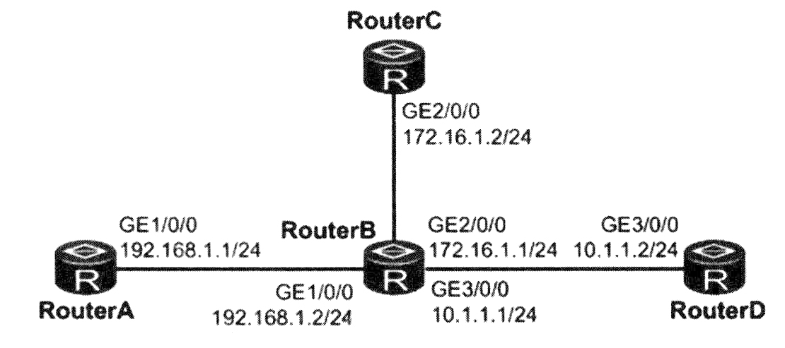 假设有如下图所示的网络拓扑结构,试通过配置使RouterA、RouterB、RouterC和RouterD的所有接口上使能RIP,并使用RIP-2进行网络互连。