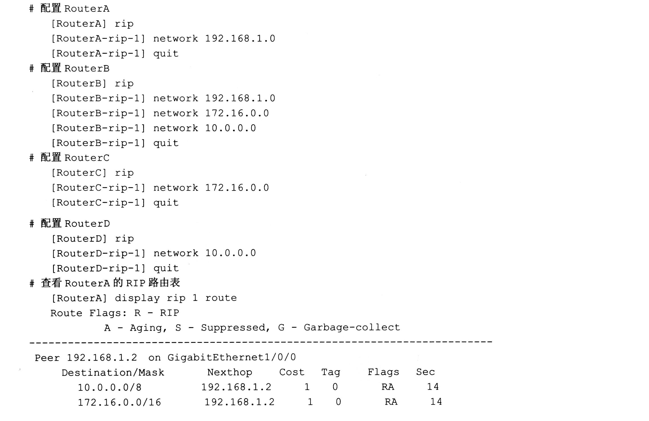 ◆在RouterB上指定使能RIP的网段192.168.1.0,172.16.0.0,10.0.0.0。