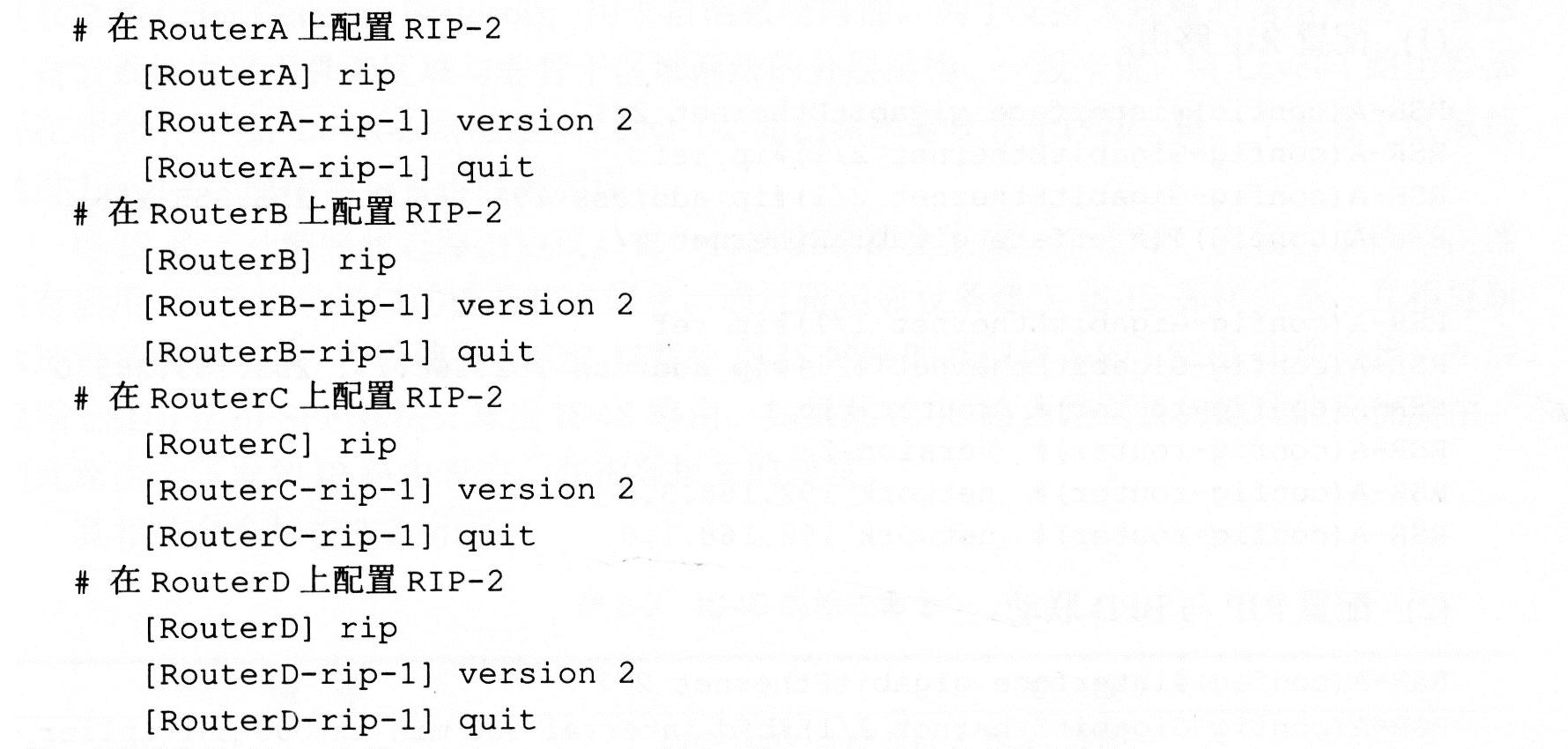 ◆在RouterA、RouterB、RouterC和RouterD上配置RIP-2版本。
