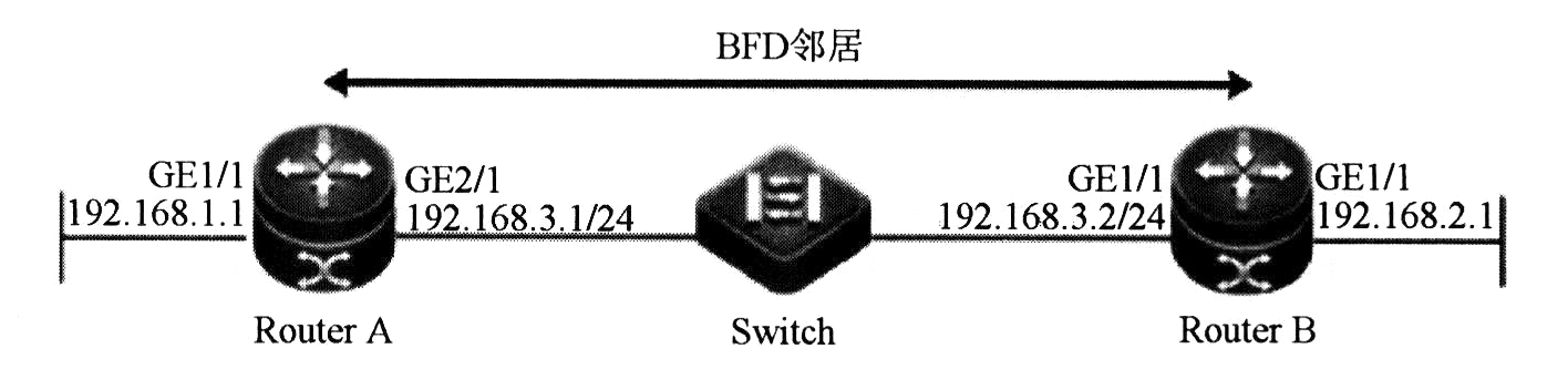 假设有如下图所示的网络拓扑结构,Router A、Router B通过二层交换机switch互连,在设备上运行RIP协议来建立路由,同时使能允许RIP在双方接口上关联BFD应用。在Router B和二层交换机switch之间的链路发生故障后,BFD能够快速检测并通告RIP协议,触发协议快速收敛。