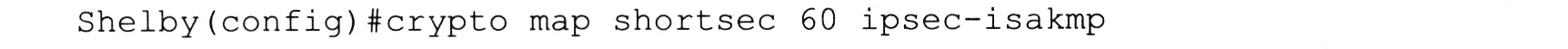 说明:以上命令为定义生成新保密密钥的周期。如果攻击者破解了保密密钥,他就能够解开使用同一个密钥的所有通信。基于这个原因,我们要设置一个较短的密钥更新周期。比如,每分钟生成一个新密钥。这个命令在VPN两端的路由器上必须匹配。参数shortsec是我们给这个配置定义的名称,稍后可以将它与路由器的外部接口建立关联。