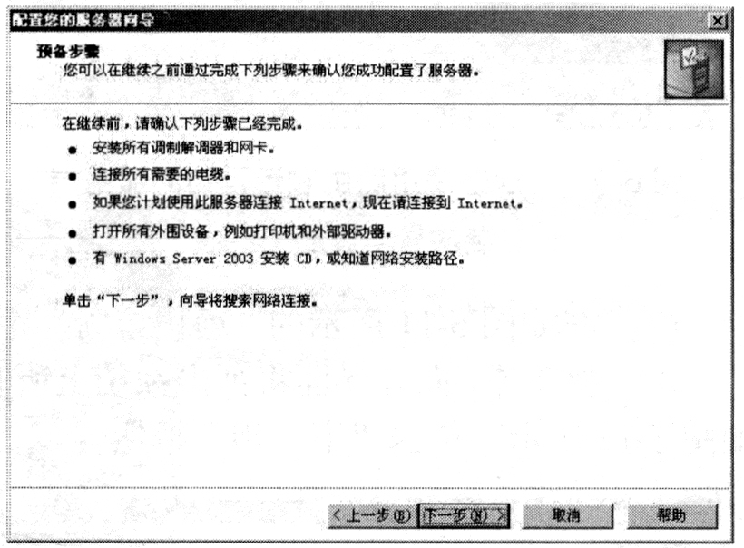 (1)以管理员身份登录Windows Server 2003,依次选择"开始"→"管理工具"命令,运行"配置您的服务器向导"命令,启动如下图所示的"配置您的服务器向导"对话框。