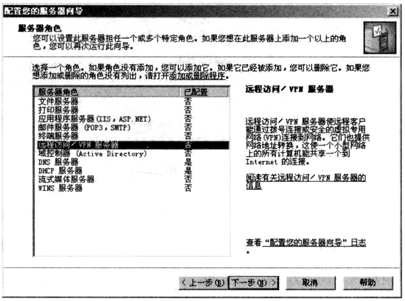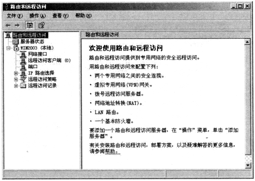 Windows Server 2003中VPN服务被称为"路由和远程访问",默认状态已经安装。只需对此服务进行必要的配置使其生效即可。创建VPN服务器的步骤如下。