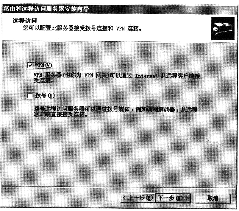 (7)在如下图所示的"远程访问"界面中,选中VPN复选框,单击"下一步"按钮。