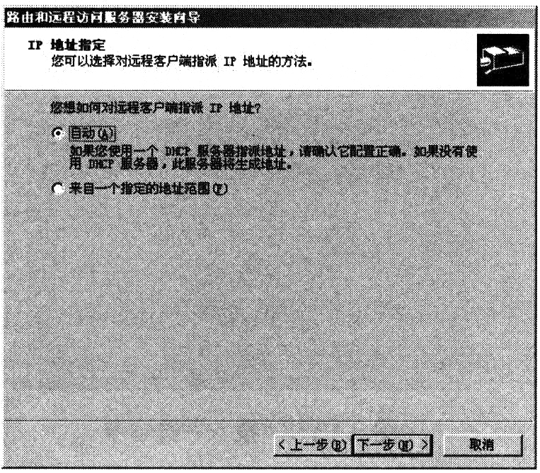 (9)在如下图所示的"IP地址指定"界面中,需要选择如何为远程客户端分配IP地址。如果局域网中配置了DHCP服务器,则可由DHCP服务器从其地址池中为远程客户分配IP地址,否则需要手工设置一个IP地址范围,用于分配给远程客户端使用。这里我们选中"自动"单选按钮,单击"下一步"按钮。