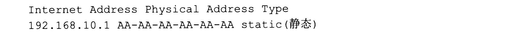 例如,使用arp -s命令,实现IP地址192.168.10.1和物理地址AA-AA-AA-AA-AA-AA之间的静态绑定。