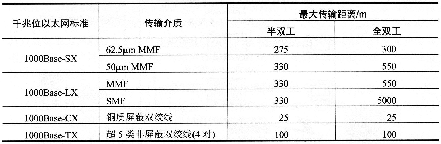 千兆位以太网是IEEE 802.3标准的扩展,在保持与以太网和快速以太网设备兼容的同时,提供1000Mb/s的数据带宽。千兆位以太网为交换机到交换机和交换机到节点工作站的连接提供了新的全双工操作模式,还为采用中继器和CSMA/CD共享连接提供了半双工操作模式。千兆位以太网与IEEE 802.3网络采用同样的帧格式、大小以及管理方式。它最初要求使用光纤电缆,但目前在5类非屏蔽双绞线电缆中也能很好地实现。