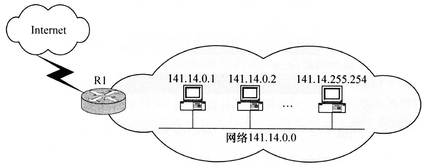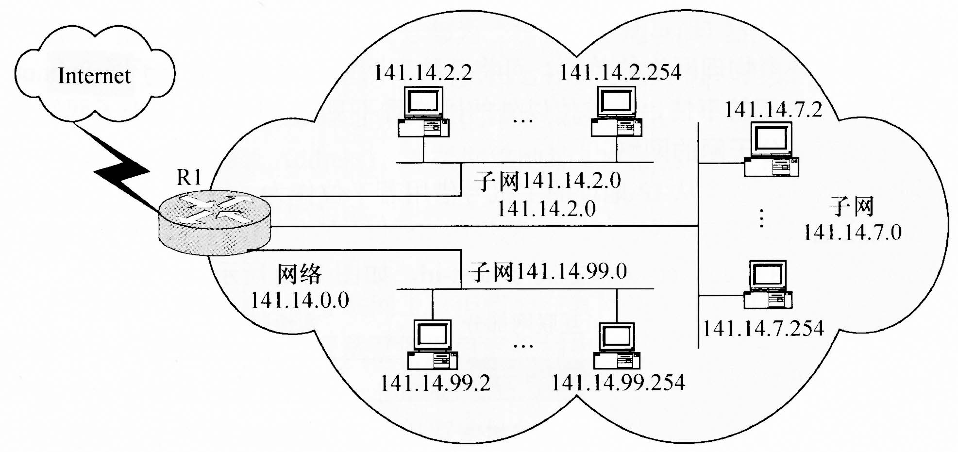 下面用一个例子来说明划分子网的概念。一个单位拥有一个B类IP地址,网络地址是141.14.0.0(net-id是141.14)。凡目的地址为141.14.x.x的数据报都被送到这个网络上的路由器R1。