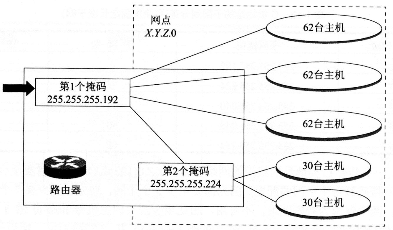 解决这个问题的一种方法是使用变长子网划分,在这种配置中路由器使用两个不同的掩码。它先使用具有26个1的掩码(11111111.11111111.11111111.11000000或255.255. 255.192),将网络划分为4个子网。然后再对其中的一个子网使用具有27个1的掩码(11111111.11111111.11111111.11100000或255.255.255.224),将其划分为两个更小的子网(见下图)。