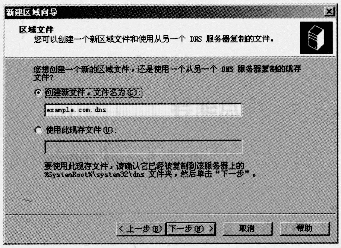 (5)在"区域文件"对话框中,选中"创建新文件,文件名为"单选按钮,并使用系统默认的文件名example.com.dns,单击"下一步"按钮,如下图所示。