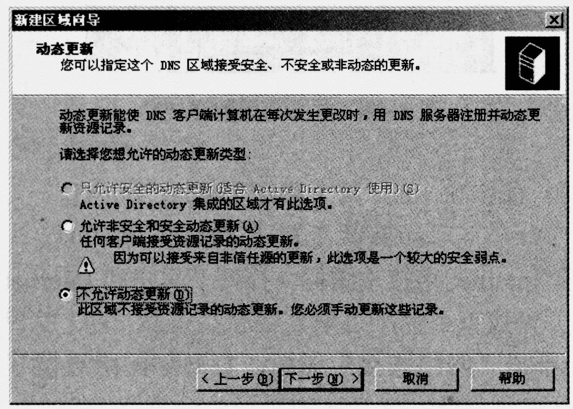 (6)在"动态更新"对话框中,选中"不允许动态更新"单选按钮,如果服务器已安装了Active Directory,也可以选中"只允许安全的动态更新"单选按钮,以便最大限度地集成和支持Active Directory以及增强的DNS服务器功能。单击"下一步"按钮,如下图所示。
