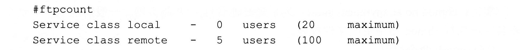 使用ftpcount命令可以十分清楚地统计出当前连接到FTP服务器上的用户数,并且同时列出上限。命令输出如下: