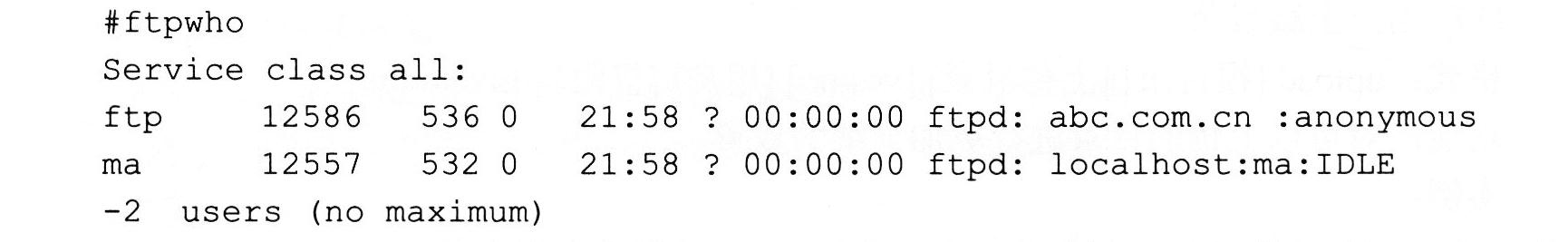 使用ftpwho命令可以查看当前连接用户的详细情况。命令输入如下: