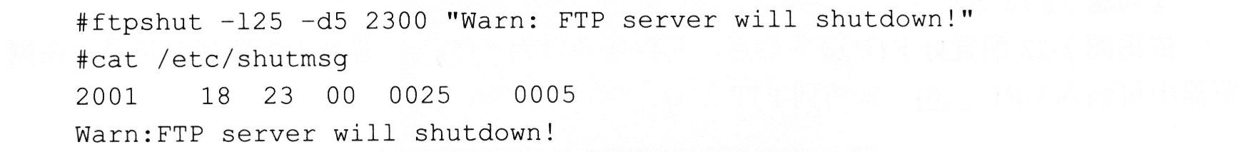 可以使用ftpshut命令生成一个在目录/etc/ftpaccess中设置的shut.msg文件,用于关机设定。ftpshut命令的格式如下: