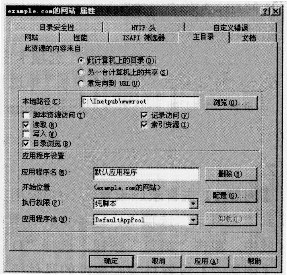 在"主目录"选项卡中指定网站Web内容的来源,如下图所示。