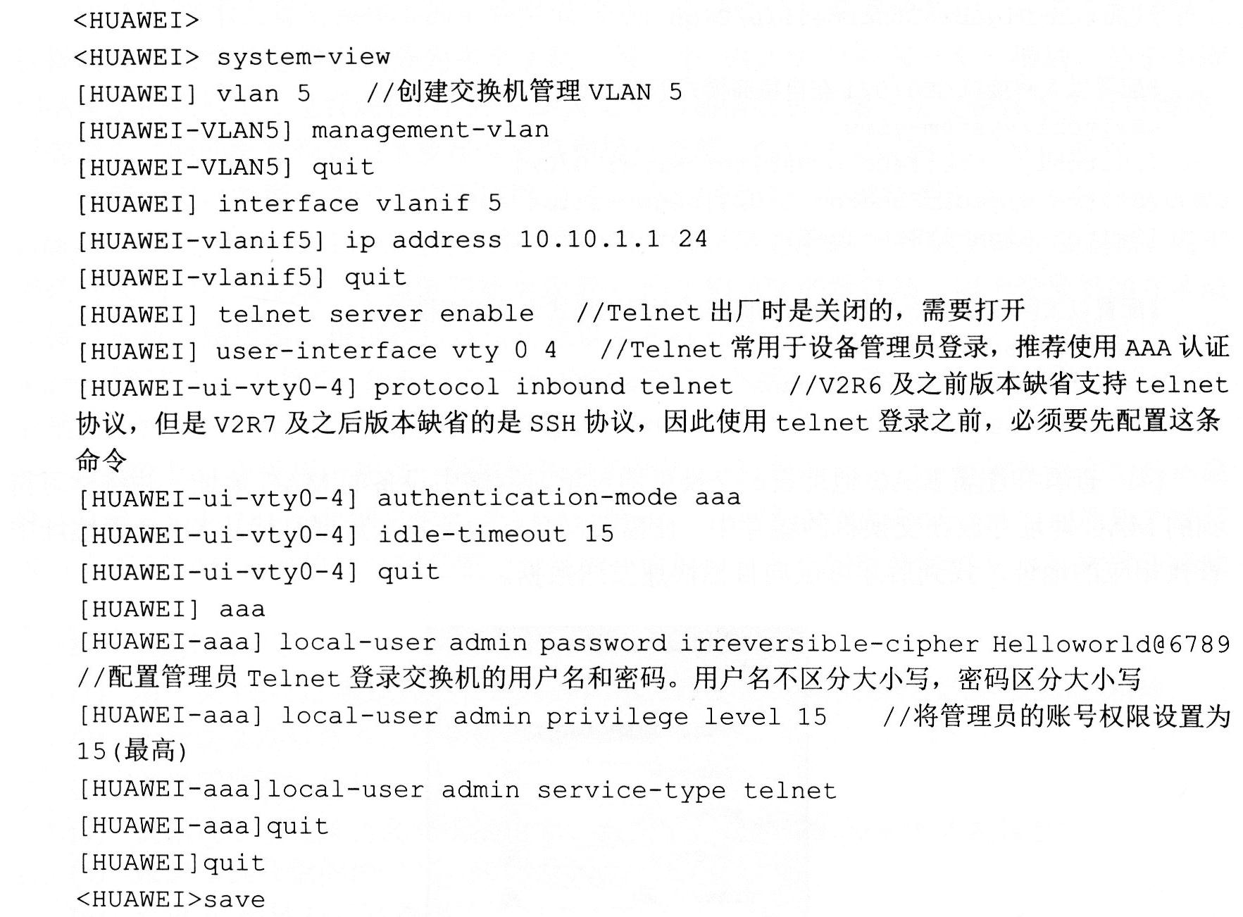 (1)配置交换机的设备名称、管理VLAN和TELNET,在对网络中交换机进行管理时需要对交换机进行基本配置。