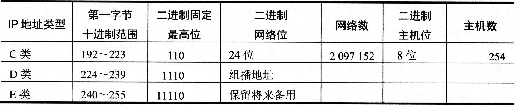 C类:一个C类地址是由3个字节的网络地址和1个字节的主机地址组成,网络地址的最高3位必须是"110"。24位作为网络号,8位作为主机号。共有221(2 097 152)个网络号,每个C类地址主机数不超过28-2(254)个。