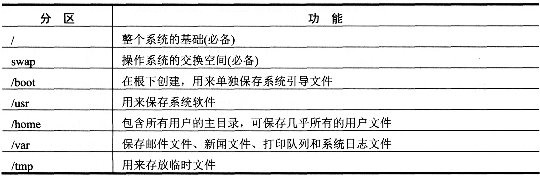 Linux系统支持多分区结构,各个分区的功能如下表所示。