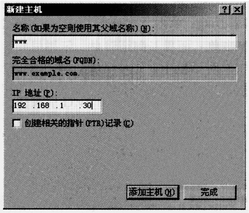 (2)在左窗格中依次展开ServerName→"正向查找区域"目录,然后用鼠标右击区域名处,从弹出的快捷菜单中选择"新建主机"命令,弹出如下图所示的对话框,输入主机名www,IP地址192.168.1.30。