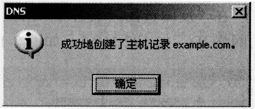 (3)如果希望DNS服务器也能够进行反向查询,则选中"创建相关的指针(PTR)记录"复选框,单击"添加主机"按钮。如果添加成功,系统会提示:"成功地创建了主机记录example.com。"如下图所示,单击"确定"按钮。