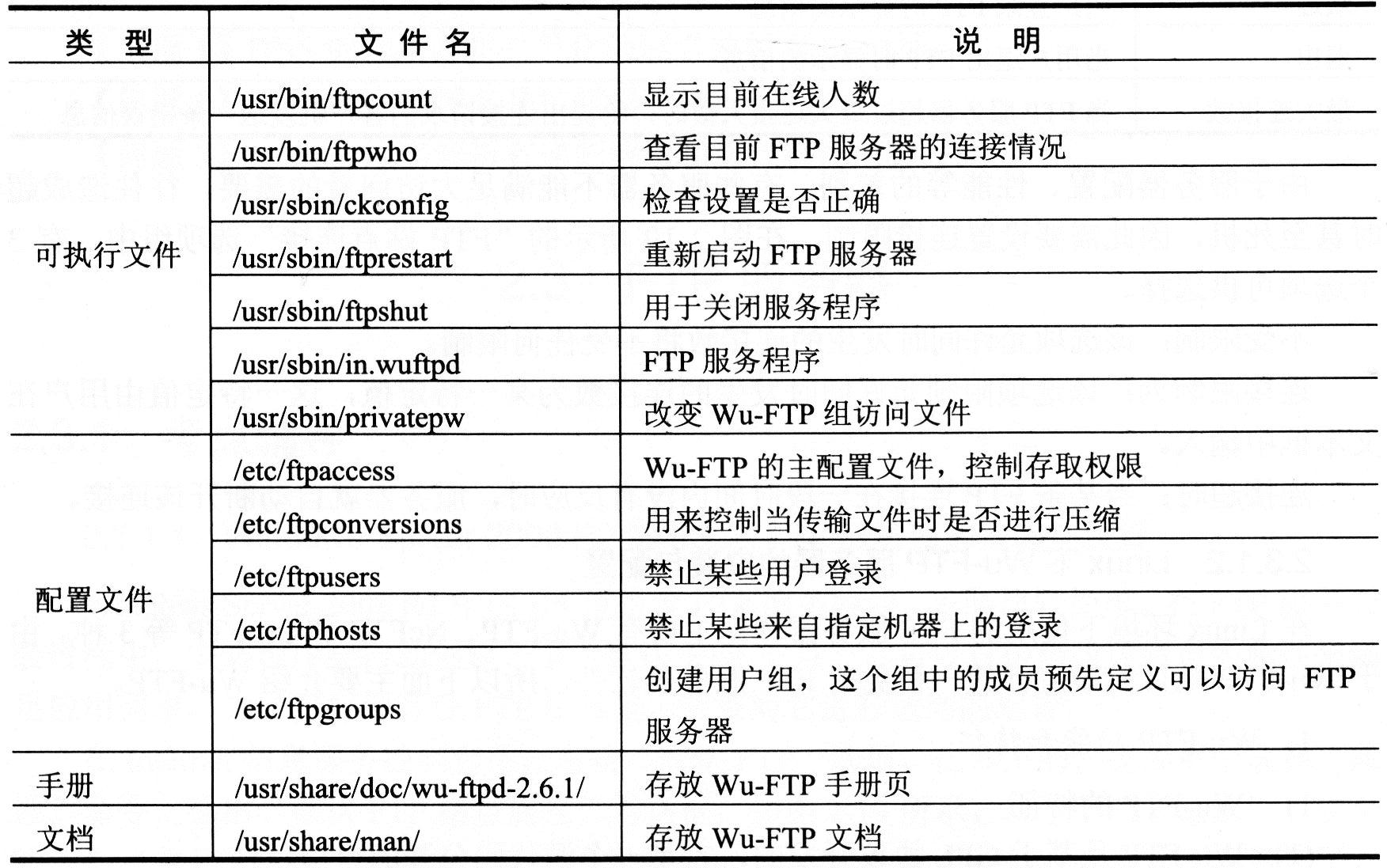 Wu-FTP有RPM包分发版本,可以从Red Hat网站下载或在Red Hat Linux 7.0的光盘中找到。二进制的分发版本可以从ftp://ftp.wu-ftpd.org/pub/wuftpd处进行下载。