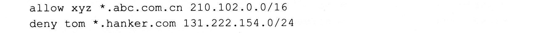 例中允许用户xyz从域名以abc.com.cn为后缀的主机及210.102.0.0/255.255.0.0的主机上登录;禁止用户Tom从域名hanker.com为后缀的主机及131.222.154.0/255.255.255.0的主机上登录。当用户名为anonymous或ftp时,均表示匿名用户。