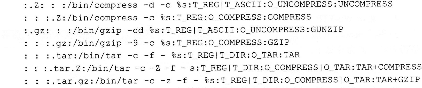 /etc/ftpconversions文件的格式乍看上去很复杂,不过不必担心,基本上不用修改、设置。下面是一个/etc/ftpconversions文件,它已经能够满足一般的使用需要了。