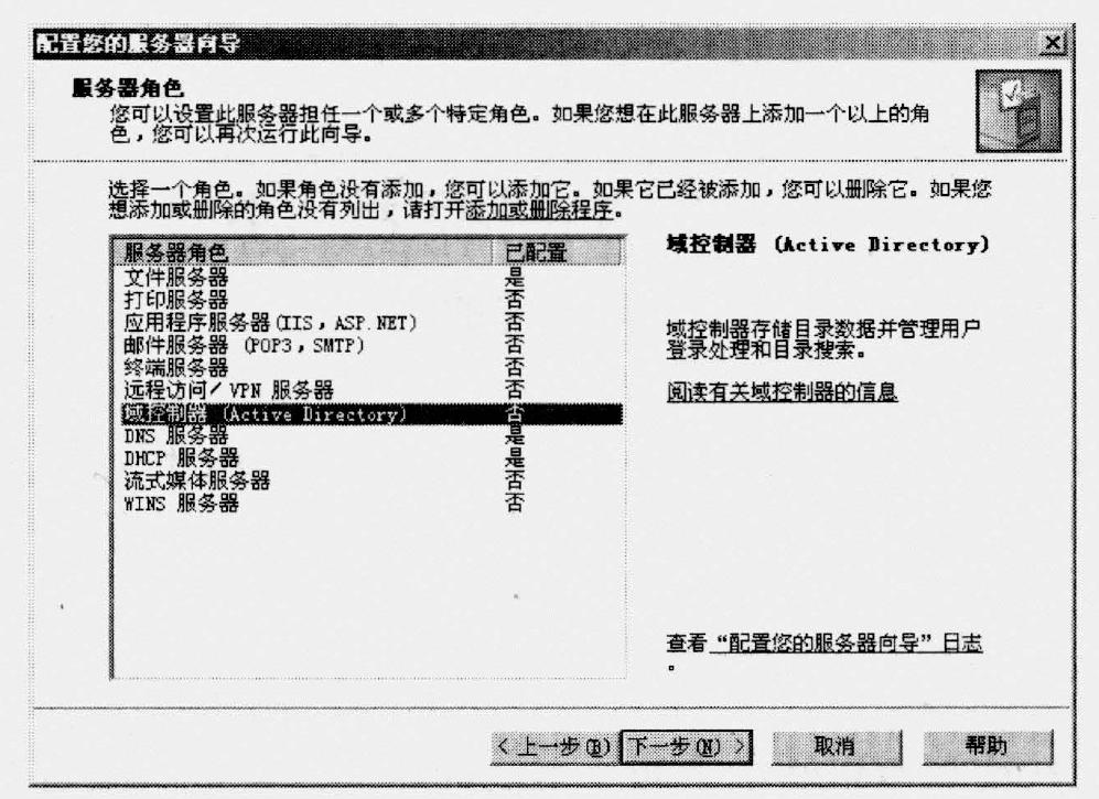 (2)向导检测网络配置,检测完毕后显示如下图所示的"服务器角色"界面,在"服务器角色"列表框中单击"域控制器(Active Directory)"选项后,单击"下一步"按钮。