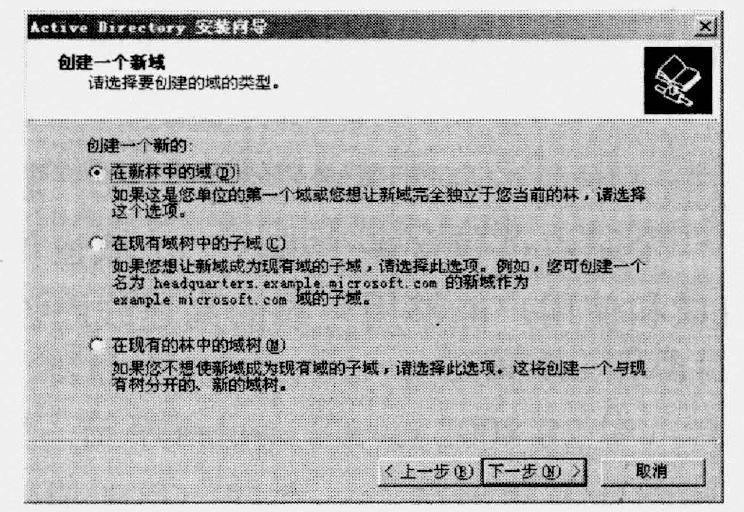 (6)单击"下一步"按钮,显示如下图所示的"创建一个新域"界面,提示选择要创建的域的类型,因为没有现有域,所以选中"在新林中的域"单选按钮。