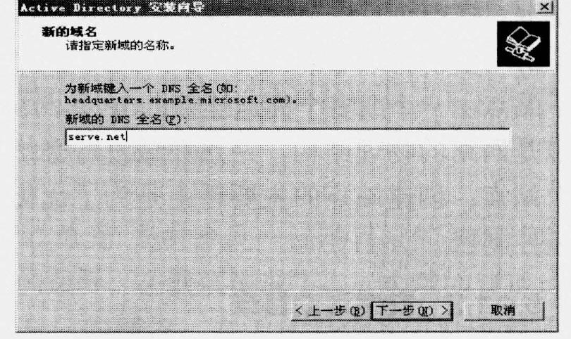 (7)单击"下一步"按钮,显示如下图所示的"新的域名"界面,在"新域的DNS全名"文本框中输入该服务器的DNS全名,如serve.net。