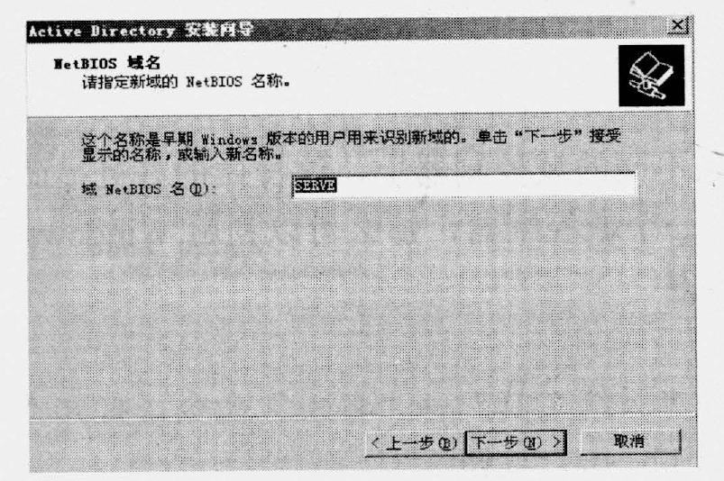 (8)单击"下一步"按钮,显示如下图所示的"NetBIOS域名"界面,在"域NetBIOS名"文本框中输入NetBIOS名,默认情况下系统使用DNS名称中最前面的部分作为NetBIOS名,如果该名称在网络中已经使用,那么系统会自动在该名称后面加上一个字符作为新域的NetBIOS名称。也可以根据需要手工指定其他名称作为新域的NetBIOS名。