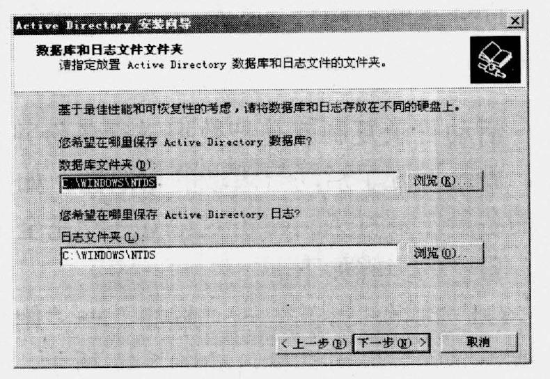 (9)单击"下一步"按钮,显示如下图所示的"数据库和日志文件文件夹"界面,指定活动目录的数据库和日志文件的存放位置,可以浏览更改的默认存放位置。