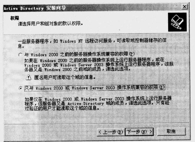 (12)单击"下一步"按钮,显示如下图所示的"权限"界面,为了使只有经过验证的用户才能读取这个域的信息,不允许匿名用户读取这个域的信息,建议选中"只与Windows 2000或Windows Server 2008 R2操作系统兼容的权限"单选按钮。