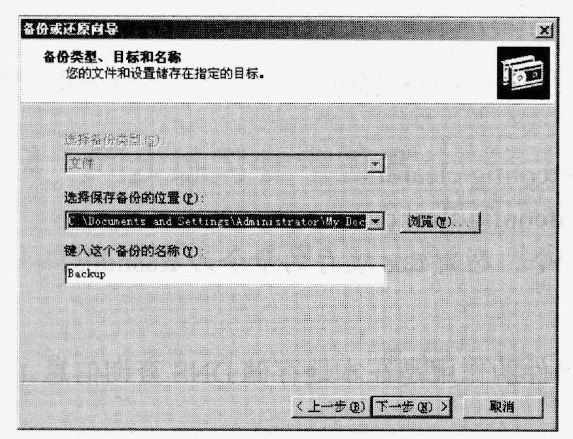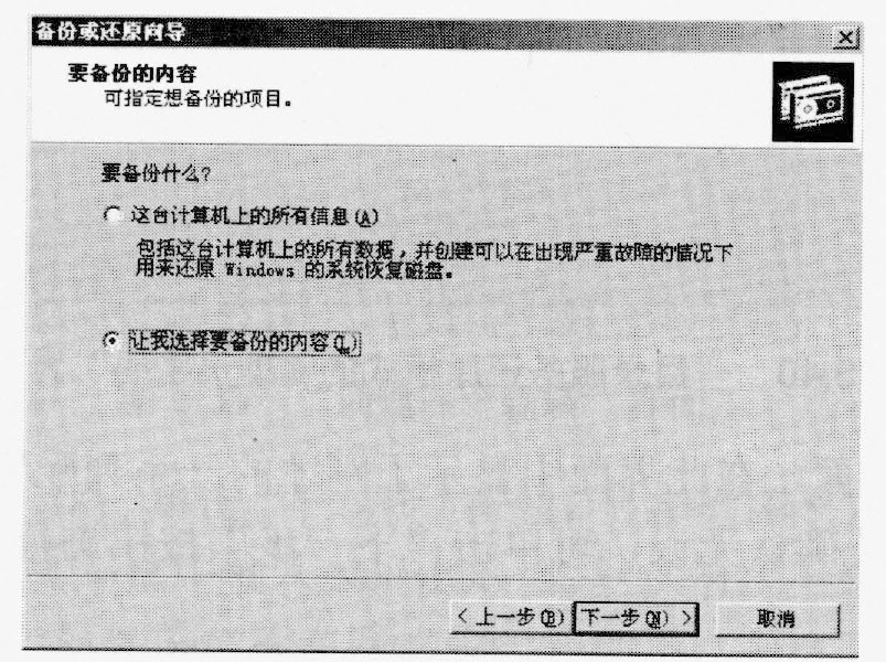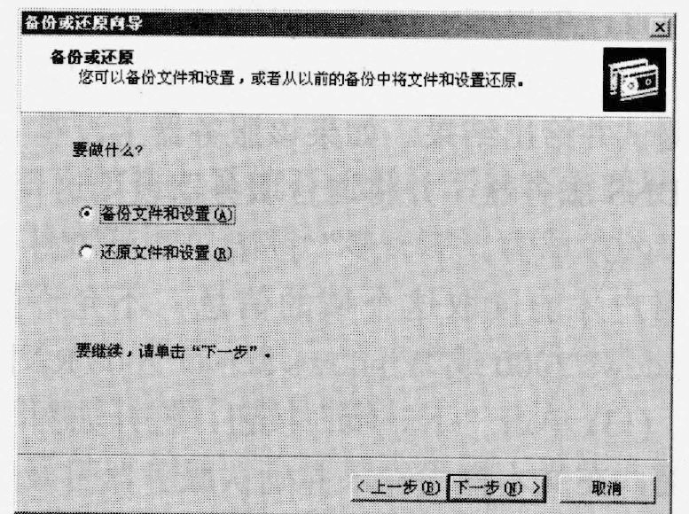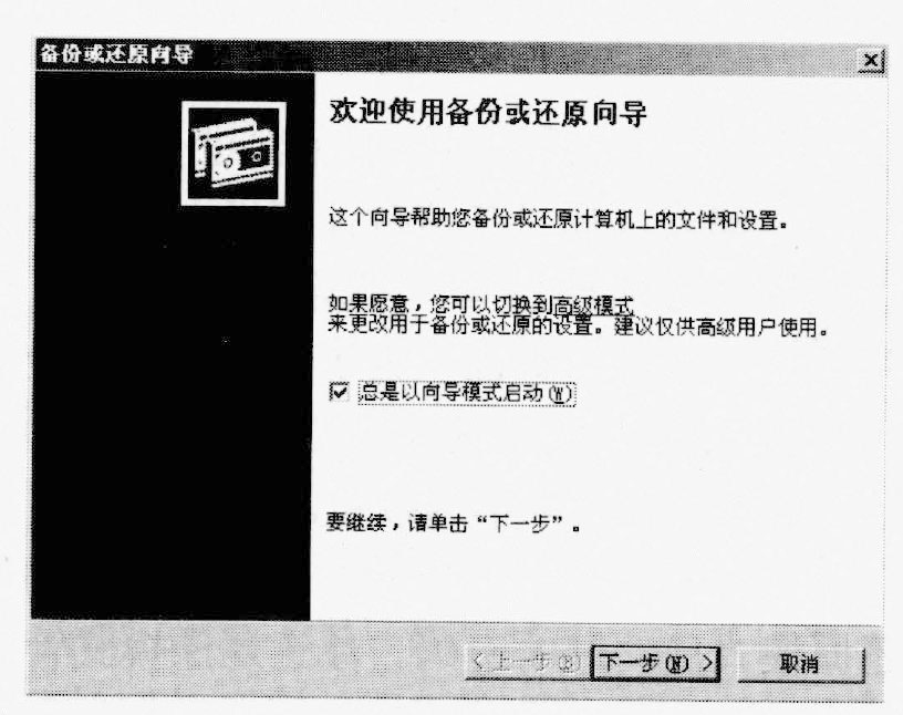(1)执行"开始"→"程序"→"附件"→"系统工具"→"备份"命令,打开"备份或还原向导"对话框,如下图所示,单击"下一步"按钮。