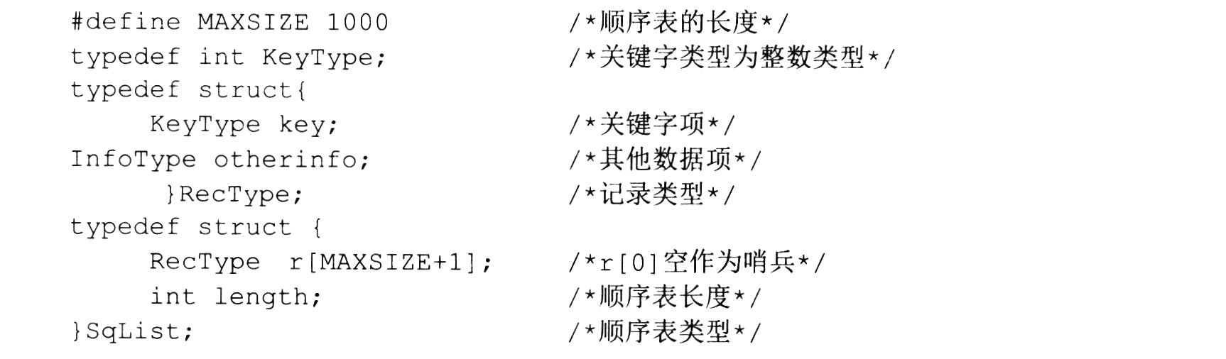 静态查找的算法有顺序查找、折半查找、分块查找和静态树查找等,其中顺序表上的顺序查找、折半查找是静态查找的重点。被查找的顺序表C类型定义如下: