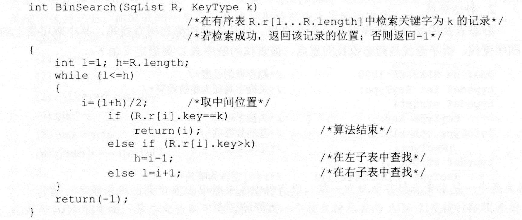 若顺序表中元素已按关键字有序排列,检索时不必顺序检索,而是用待查关键字与中间位置的元素的关键字进行比较,若相等,则检索成功;若待查关键字较小,则在由中间位置分开的左子表中查找,否则,在右子表中进行查找。如此下去,直至检索成功或检索失败。