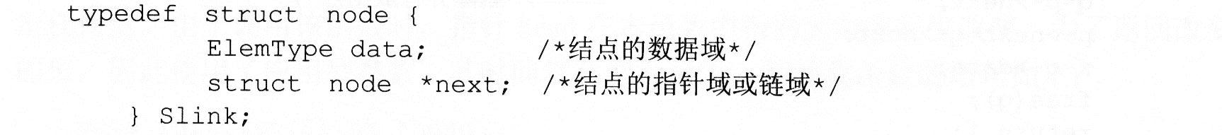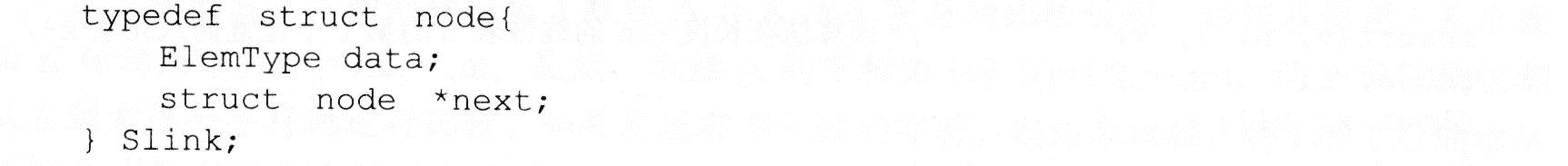 其中,data部分称为数据域,用于存储线性表的一个数据元素(结点)。next部分称为指针域或链域,用于存放一个指针,该指针指向本结点所含数据域元素的直接后继所在的结点。若数据元素的类型用ElemType表示,则单链表的类型定义如下: