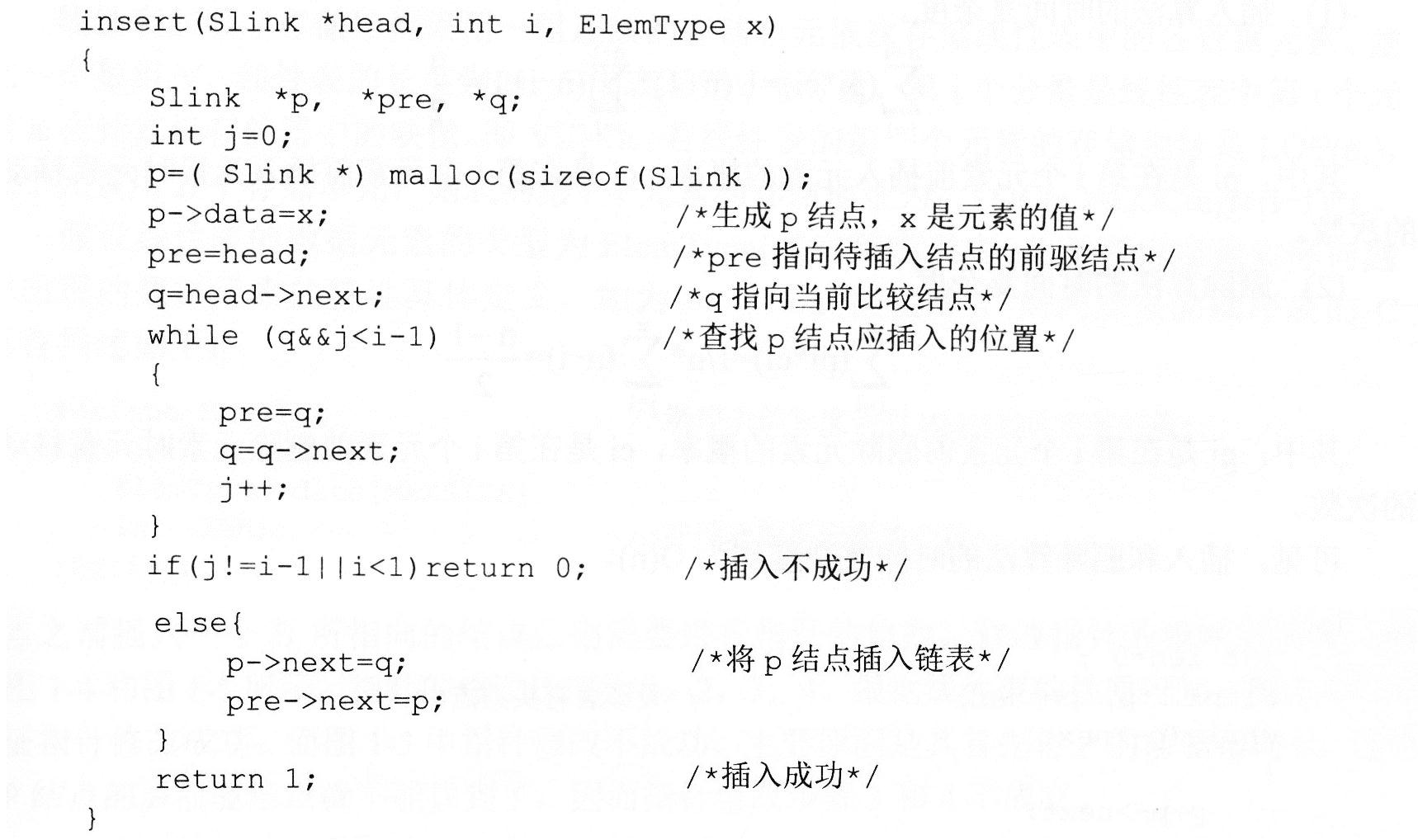 1)带头结点的单链表插入函数insert(Slink *head, int i, ElemType x)