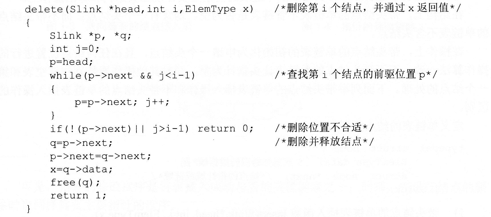 3)删除函数delete(Slink *head, int i, ElemType x)