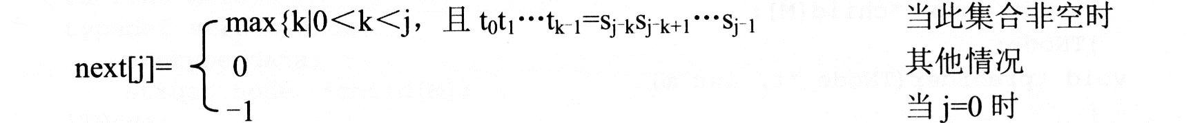 若模式串t中存在真子串t0t1…tk-1=sj-ksj-k+1…sj-1,且满足0i)不相等时,模式串中需要重新和主串中该字符si进行比较的字符位置为k,即下一次开始比较Si和tk;若不存在这样的真子串,next[j]=0,则下一次开始比较si和t0;当j=0时,令next[j]=-1,此处-1为一个标记,表示下一次开始比较si+1和t0,称每次进行了模式串的右滑。模式串右滑后若仍有si≠tk,则这个模式串的右滑过程可一直进行,直到next[j]=-1时,模式串不再右滑,下一次开始比较si+1和t0。简言之,KMP算法对Brute-Force算法的改进就是利用已经得到的部分匹配结果将模式串右滑一段距离后再继续比较,而无须回溯主串指针。