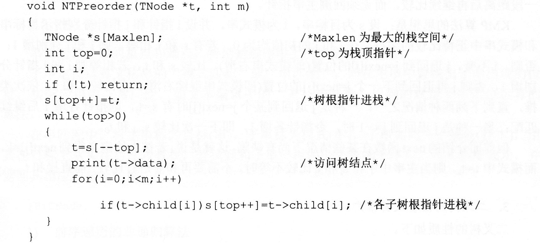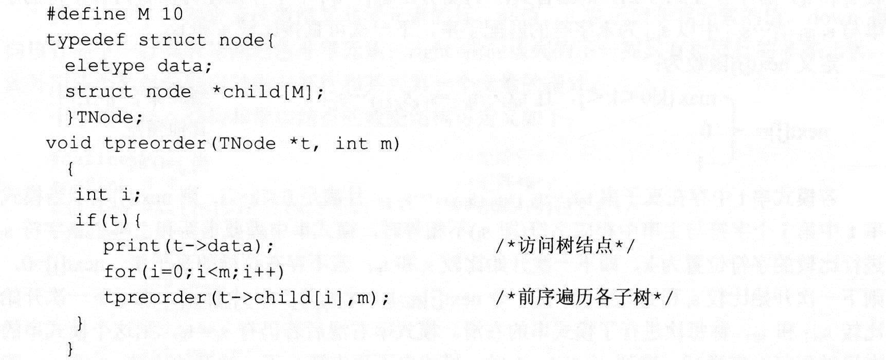 (1)树的前序遍历。首先访问根结点,然后从左到右前序遍历根结点的各棵子树。树的前序遍历递归算法如下: