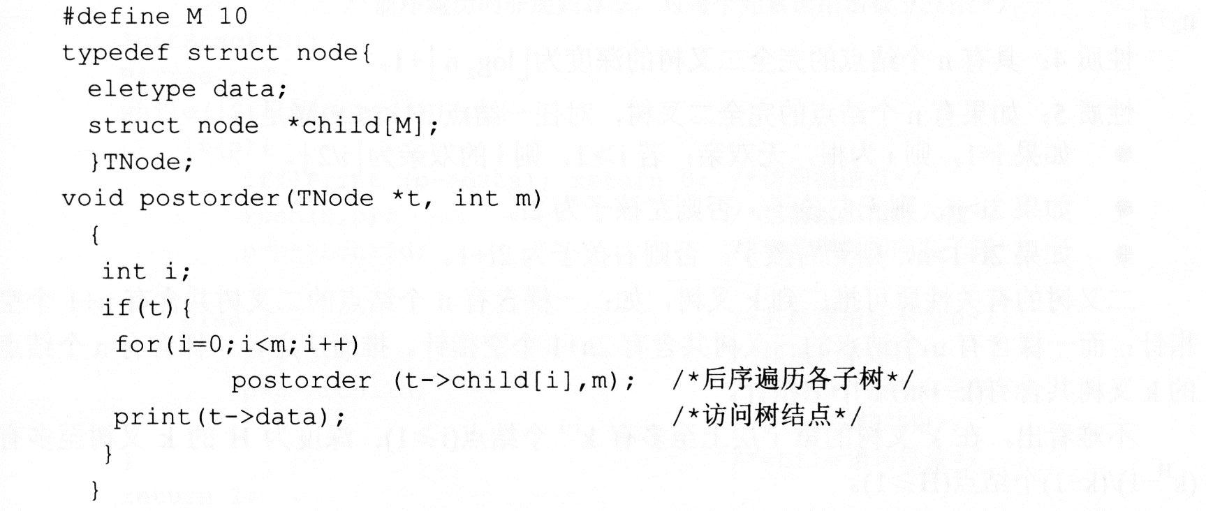 (2)树的后序遍历。树的后序遍历的基本思想是:先依次遍历每棵子树,然后访问根结点,与后序遍历二叉树相同。树的后序遍历递归算法如下:
