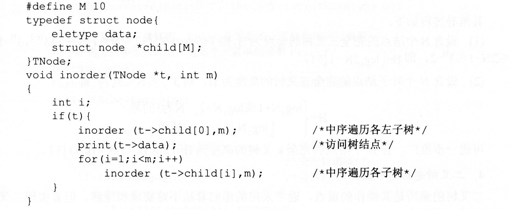 (3)树的中序遍历。树的中序遍历的基本思想是:先左子树,遍历根结点,然后依次遍历其他各棵子树,类似二叉树的中序遍历。树的中序遍历递归算法如下: