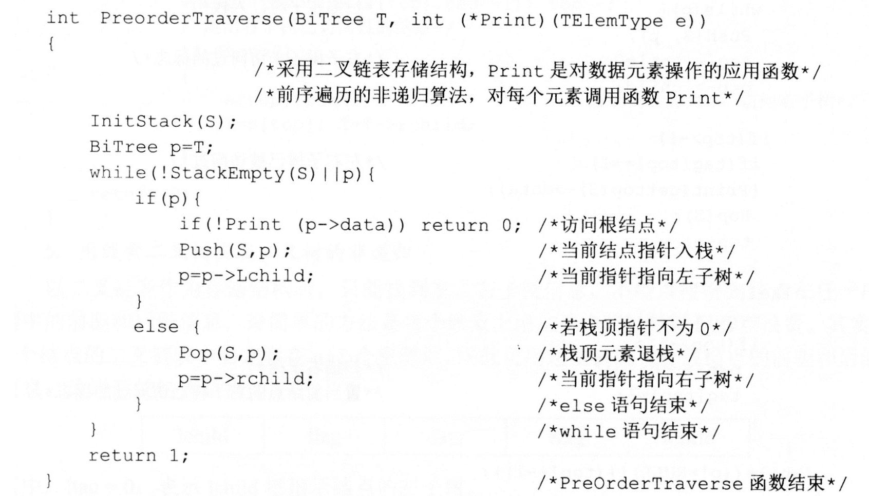 若利用栈来记录当前未访问完的子树的根结点指针,则前序遍历的非递归算法如下: