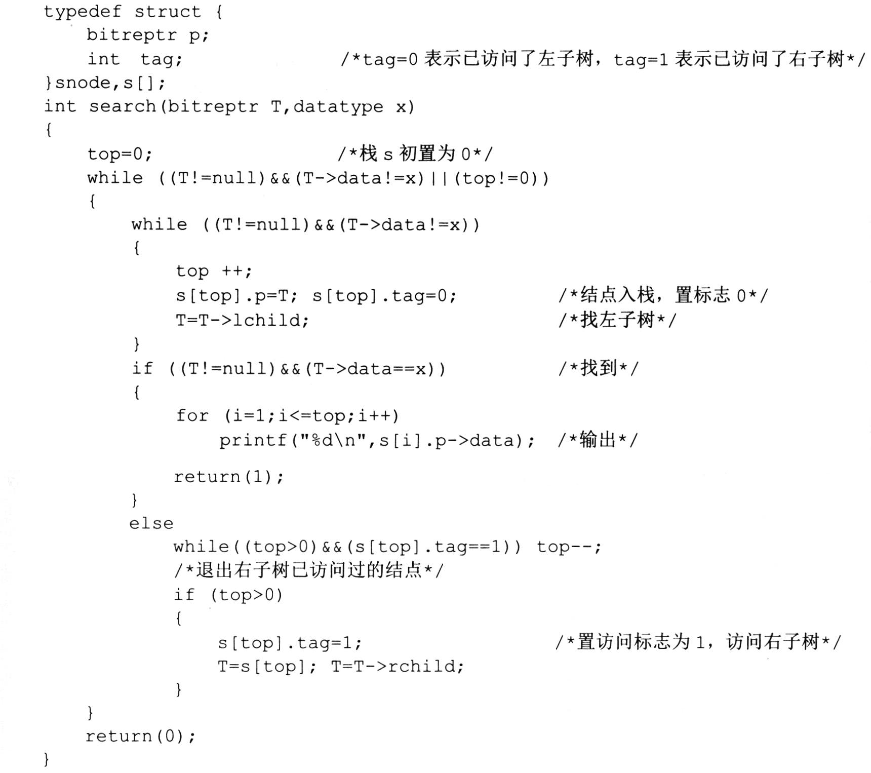 解决此问题的算法思想是:若在查找某结点的过程中,记下其祖先结点,则可以实现本问题要求。能实现这种要求的数据结构是栈,故设置一个栈用于装入x结点的所有祖先。而这种查找只有用非递归的后序遍历。