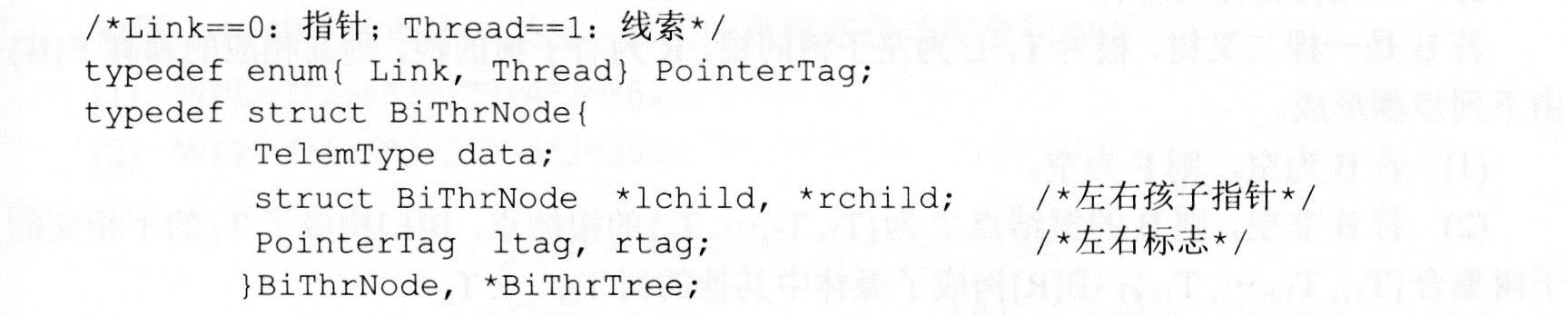 以二叉链表作为存储结构时,只能找到左、右子树信息,不能直接得到结点在任一序列中的前驱和后继信息,最简单的方法是每个结点上增加两个指针域,但有点浪费。其实,n个结点的二叉链表中必定存在n+1个空链域,因此可用这些链域来存放结点的前驱和后继信息。改进后的结点结构如下。